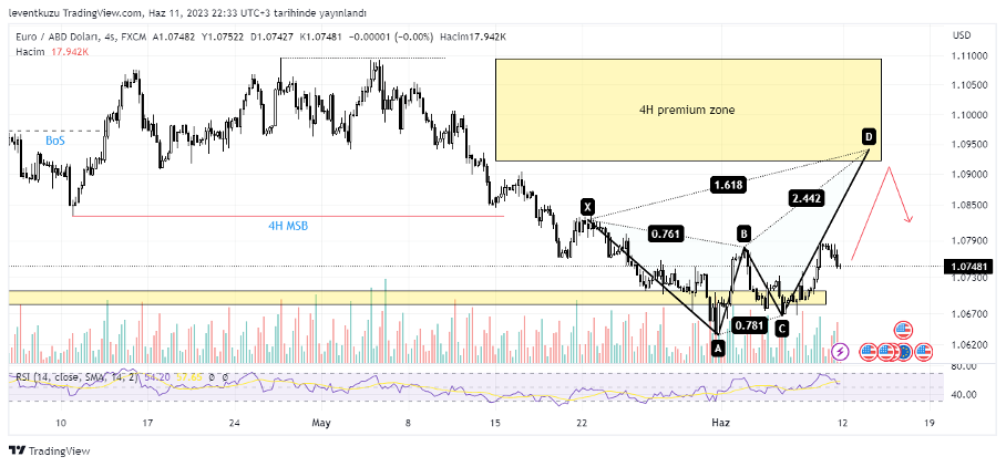 The EURUSD pair evaluated to be in bearish since the last three weeks. After the market structure break on 4H chart, the price did not reach 4H premium zone. If the early drawn bearish butterfly harmonic pattern occurs, the price could reach the premium zone. After that, retracement can occur until 0.618 of the harmonic pattern.