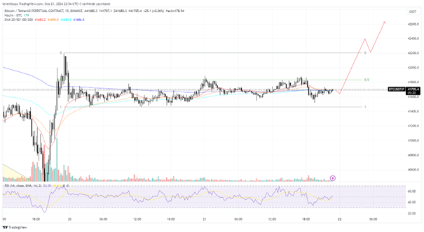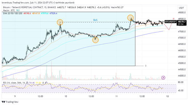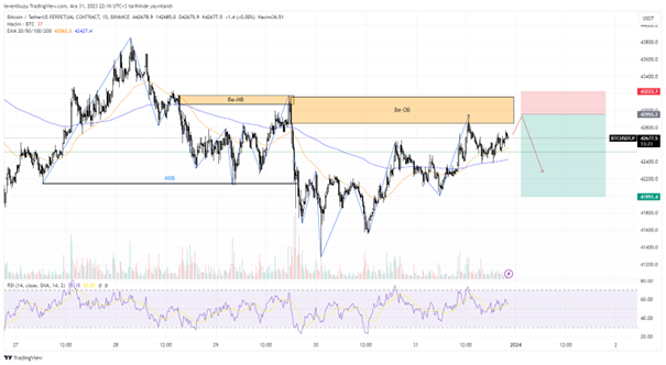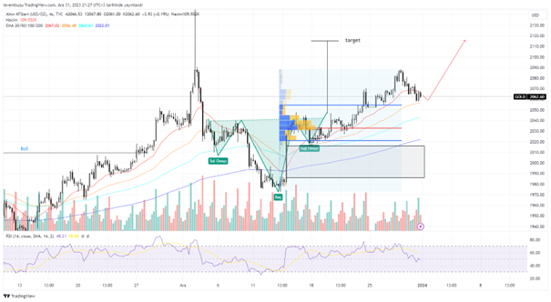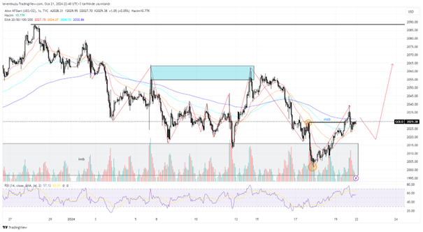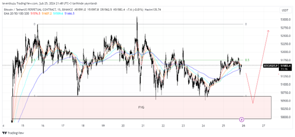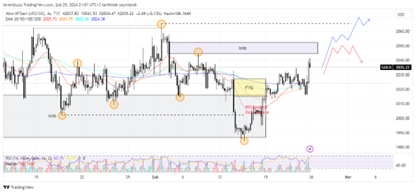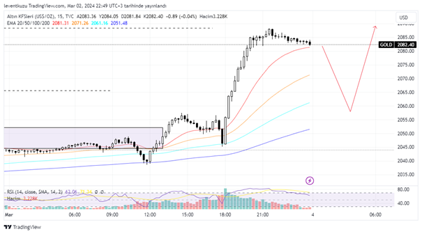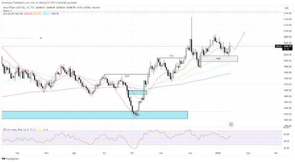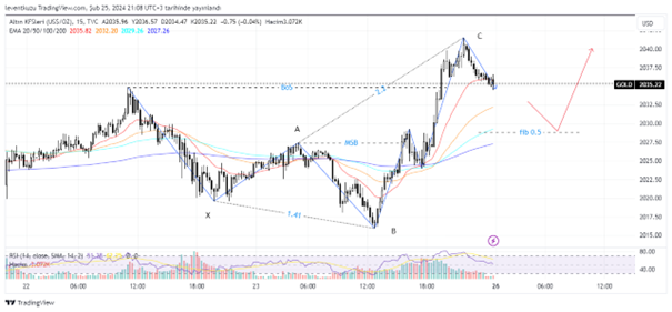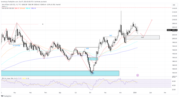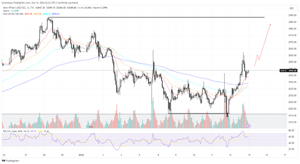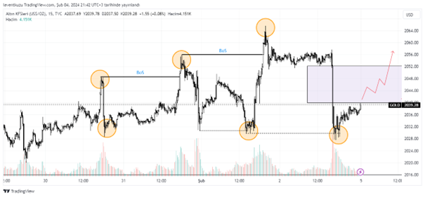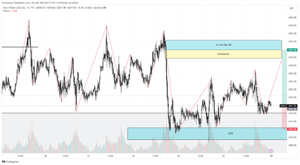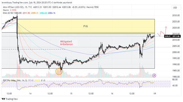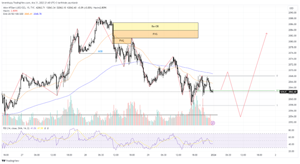 15 min chart is in line with 4 H chart. Although imbalance region is not that much clear on LTF, we can see the fair value gap around $2,060s. Probably, price will retrace until EMA200, then it will continue its bullish movement.