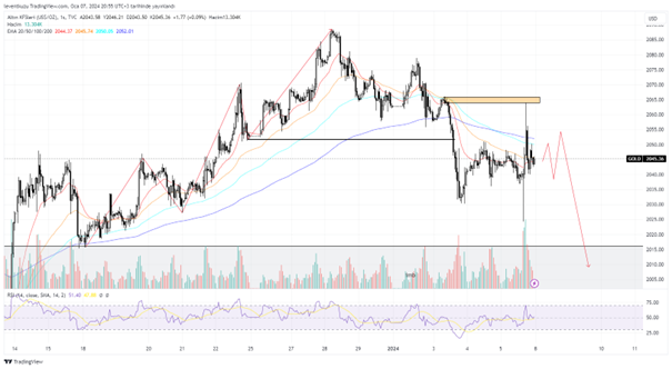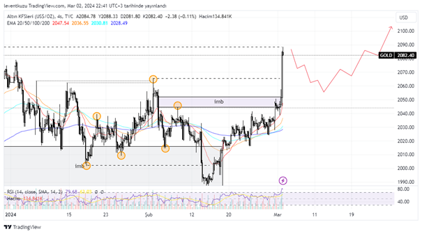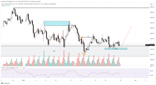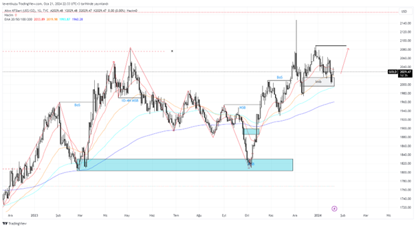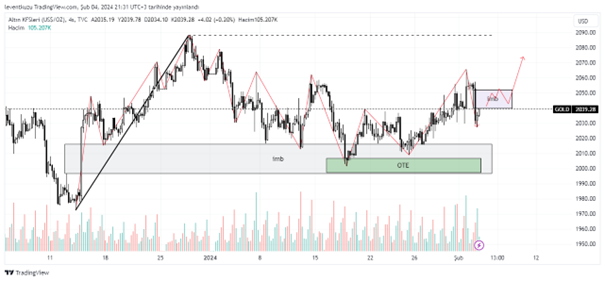 Gold reached its one of high values. But it was unable to sweep that price. The price increased with a high momentum. It left a fair value gap. We can focus on price increase after filling the fair value gap. In this scenario, price can drop $2,060s, then increase to move above $2,090.