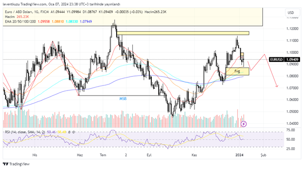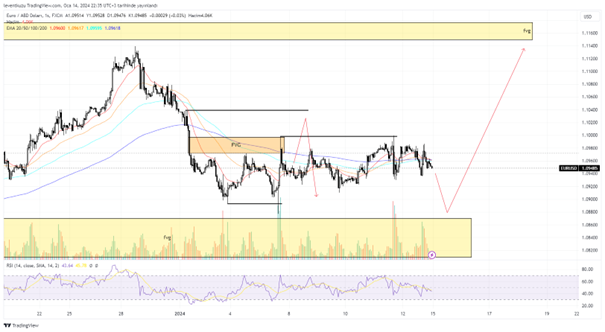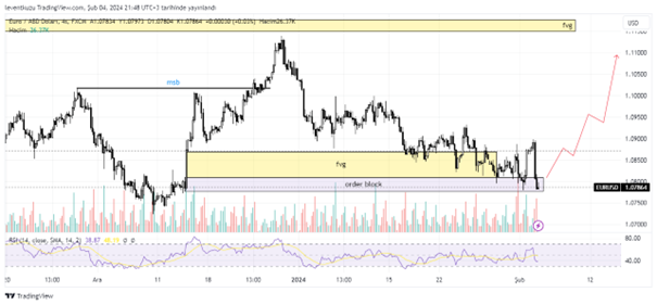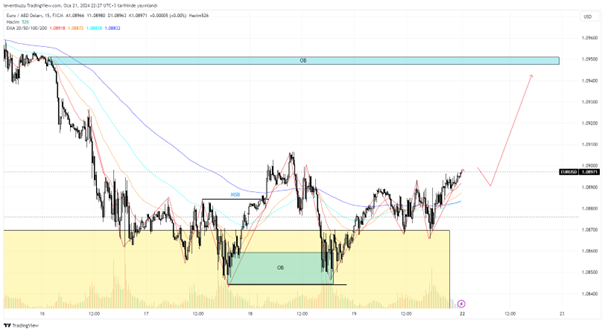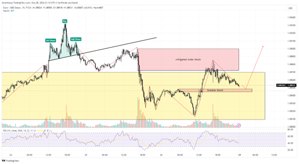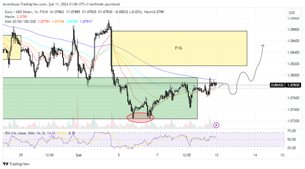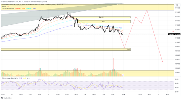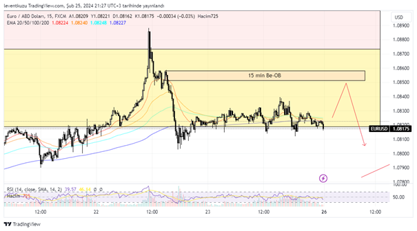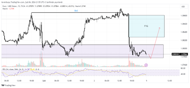Although the price is bearish, we saw some bullish candles. Examining the 15min chart, it is clear that those candles were just to fill the fair value gap that was formed by the bearish candles. Now the price has some potential to sweep the liquidity at multiple points around 1.08.
