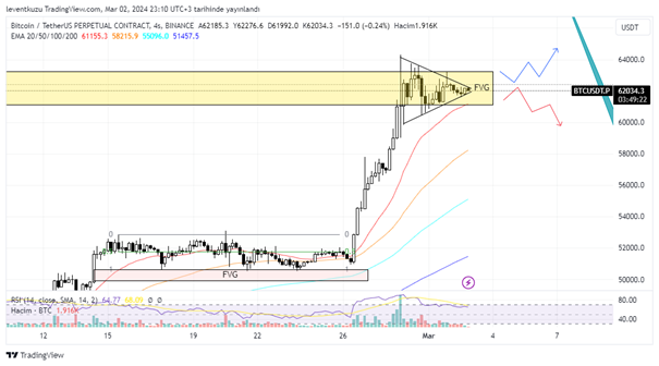 There was a massive increase in the price of BTC last week. After that move, the price started to consolidate. The price moved like forming a triangle. The price target of triangle is unclear. It can move in either ways. The consolidation is within an old FVG zone. Volume decrease is supporting the triangle. Now, we have to wait for the break of triangle and take the position according to the price direction. But we should not forget a possible deviation move.