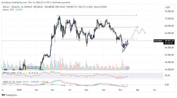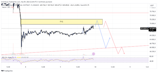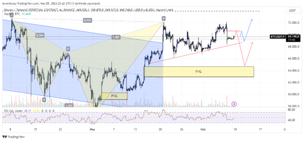 As of now, daily BTC analysis remains successful. The red price path was depicted last week and is still valid. The price was close to range low level and entered the range again. After some increase, it formed a decreasing channel. As of end of the last week, it was broken on bullish side. Equilibrium of the range held the price. There are three wicks but candles were unable to close above the Eq. also considering the current state of overbought RSI, we can experience a price loss to fill some of FVG during the impulsive move. $64k is an important area, where BTC can gain performance to start a movement to test $74k.