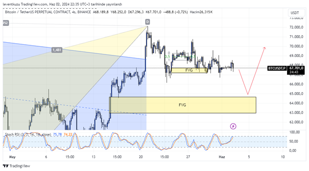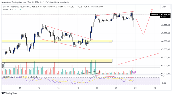 There is a significant bearish RSI divergence on 1H chart. It was artificially being pushed up. Low trade volumes also confirms this during the weekend. Recently, there was a sell off and BTC dropped $1000 in a short time. But buyers was strong and they bought the sold BTC. According to bearish signs, $64-65k can be a fuel to push BTC higher price levels.